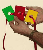 Magician shows three different colored Panels, with a hole in them, and a length of Ribbon. A spectator selects any color, which is placed between the other two, and the Ribbon threaded through the center of the Panels. Magician spreads the Panels to show Ribbon passes through them, puts them together, and places a Rubber band around the Panels. The Ribbon is pulled to and fro to show it passes through the Panels.